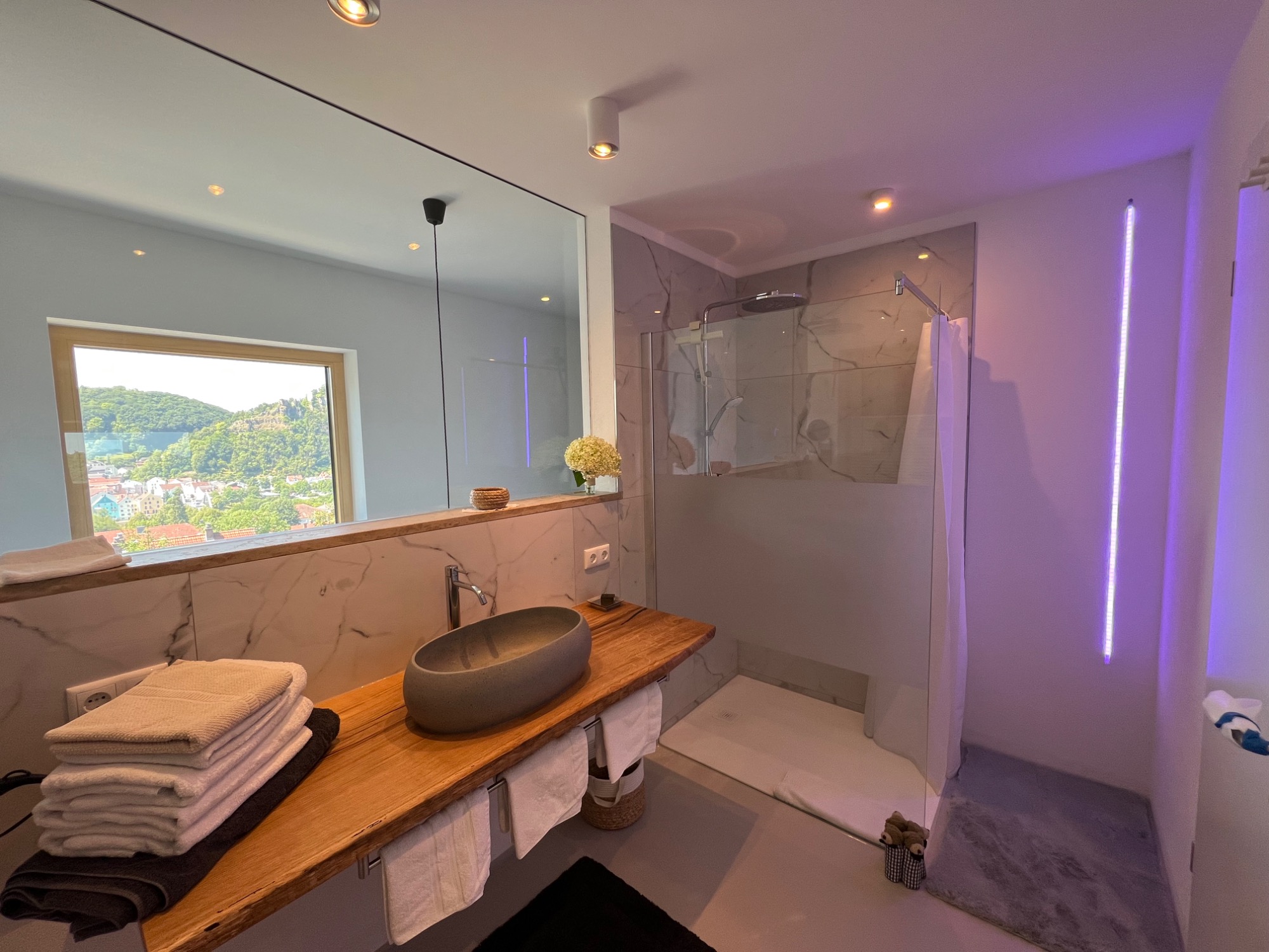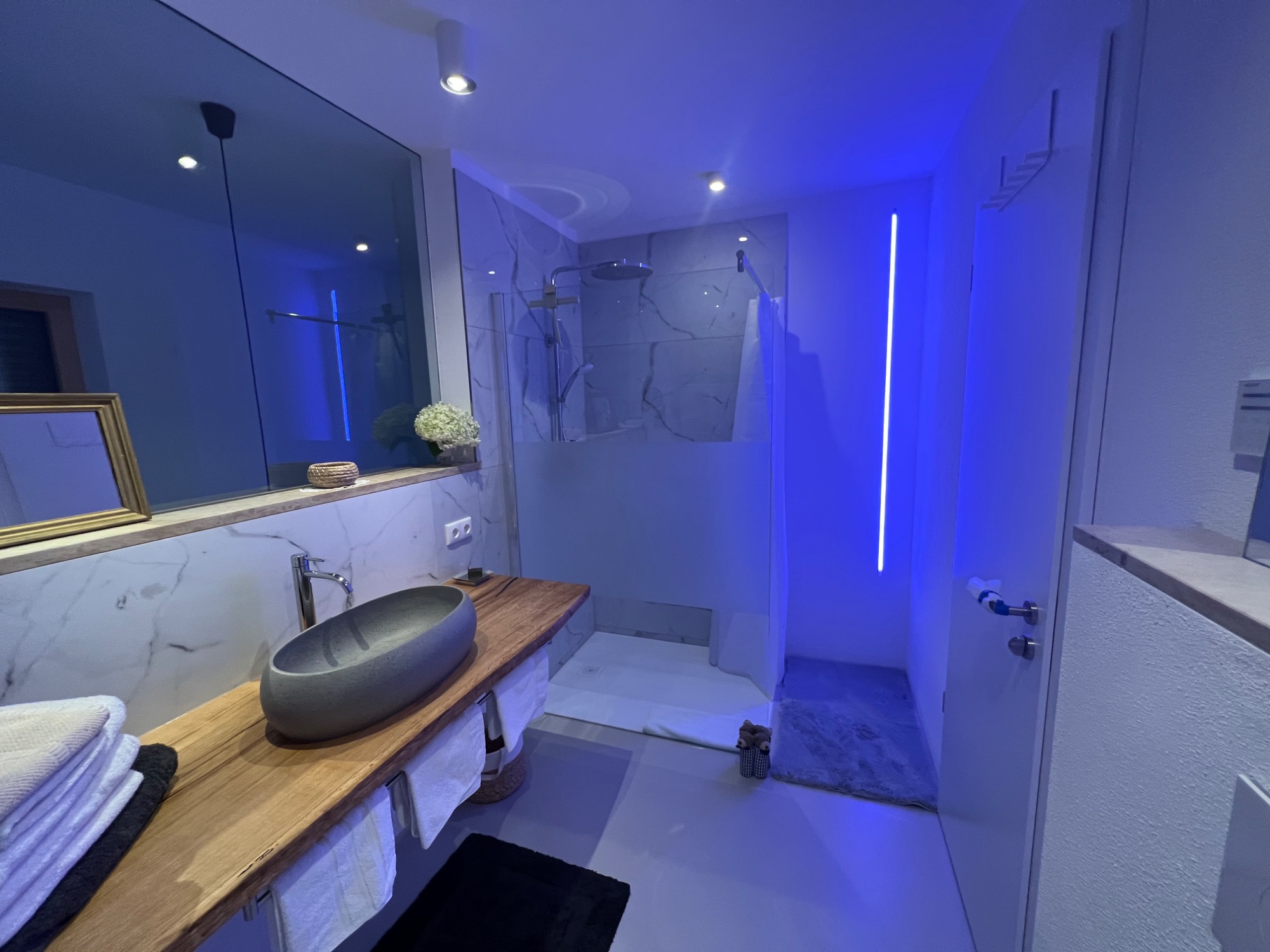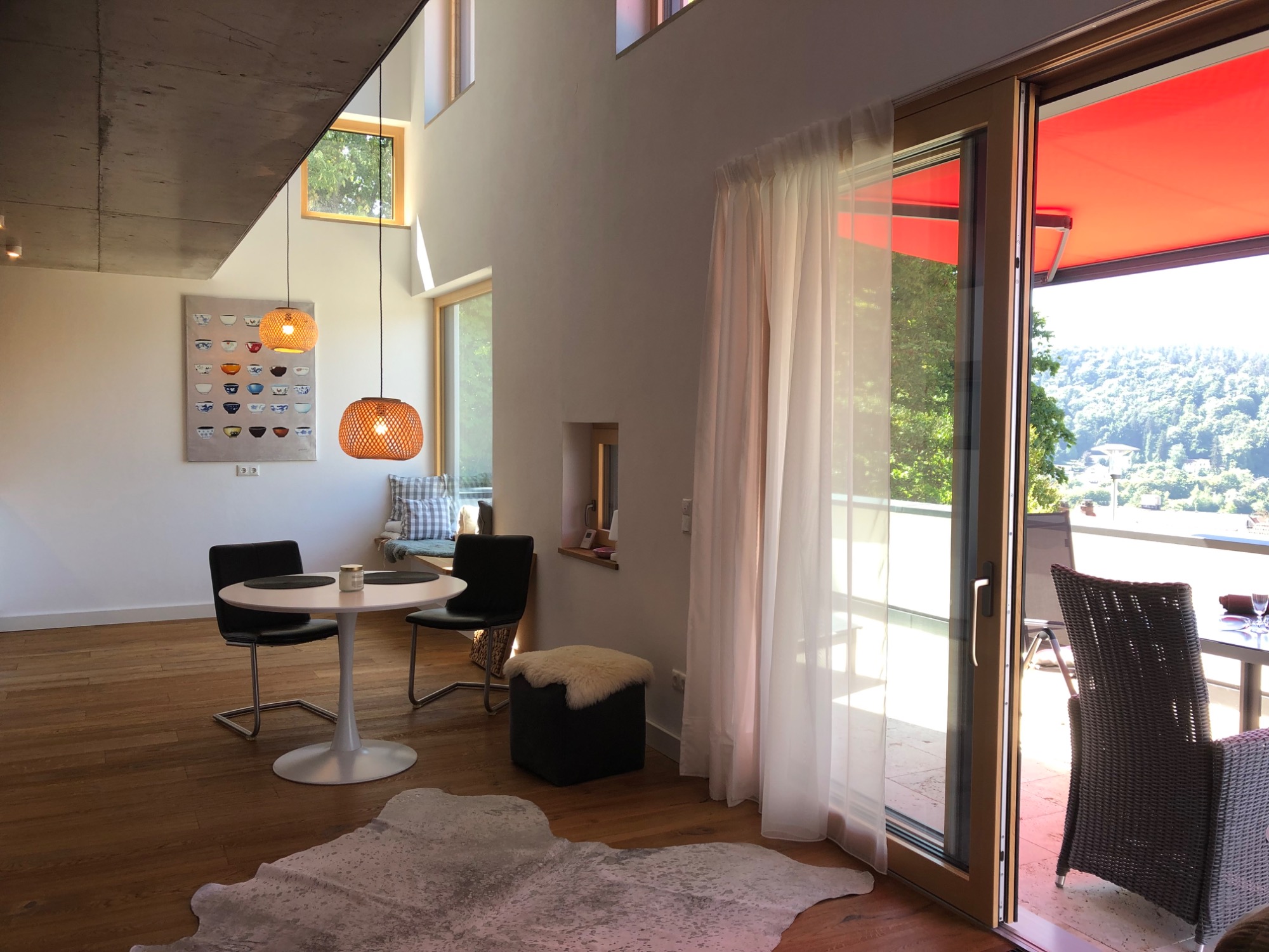 Elektrische Aussenjalousien sind an allen Fenstern vorhanden. Dank der Lüftungsanlage herrscht in der Wohnung ein ideales Raumklima. Es wurde ein ausdünstungsfreier biologischer Gussboden verbaut. Der Wohn/Eßbereich ist mit hochwertigen Eichendielen ausgestattet. Eine moderne Küche mit Backofen und einem Dunstabzug in der Kochplatte zählen zu den Besonderheiten. Eine zusätzliches Schlafzimmer bietet Platz für bis zu vier Personen. Entspannen Sie sich auf dem großzügigen Balkon mit elektrischer Markise , Gartenmöbeln und einem atemberaubendem Blick über Riedenburg in herrlicher Südwestlage. WLAN ist vorhanden. Parkmöglichkeiten sind direkt vor dem Chalet vorhanden. Ausserdem eine abschließbare Garage mit Lademöglichkeit für Ebikes und Fahrräder. Lademöglichkeit für E-Autos ist gegeben.